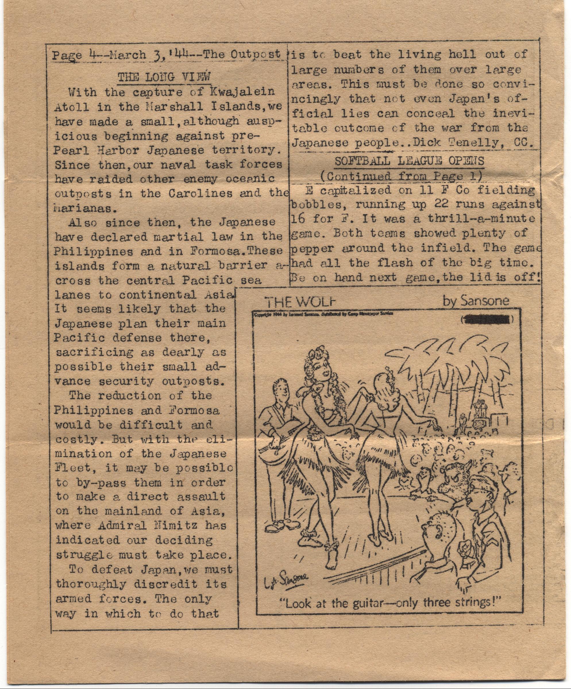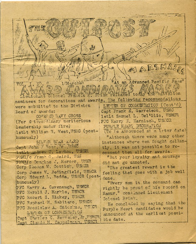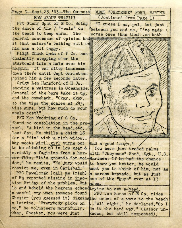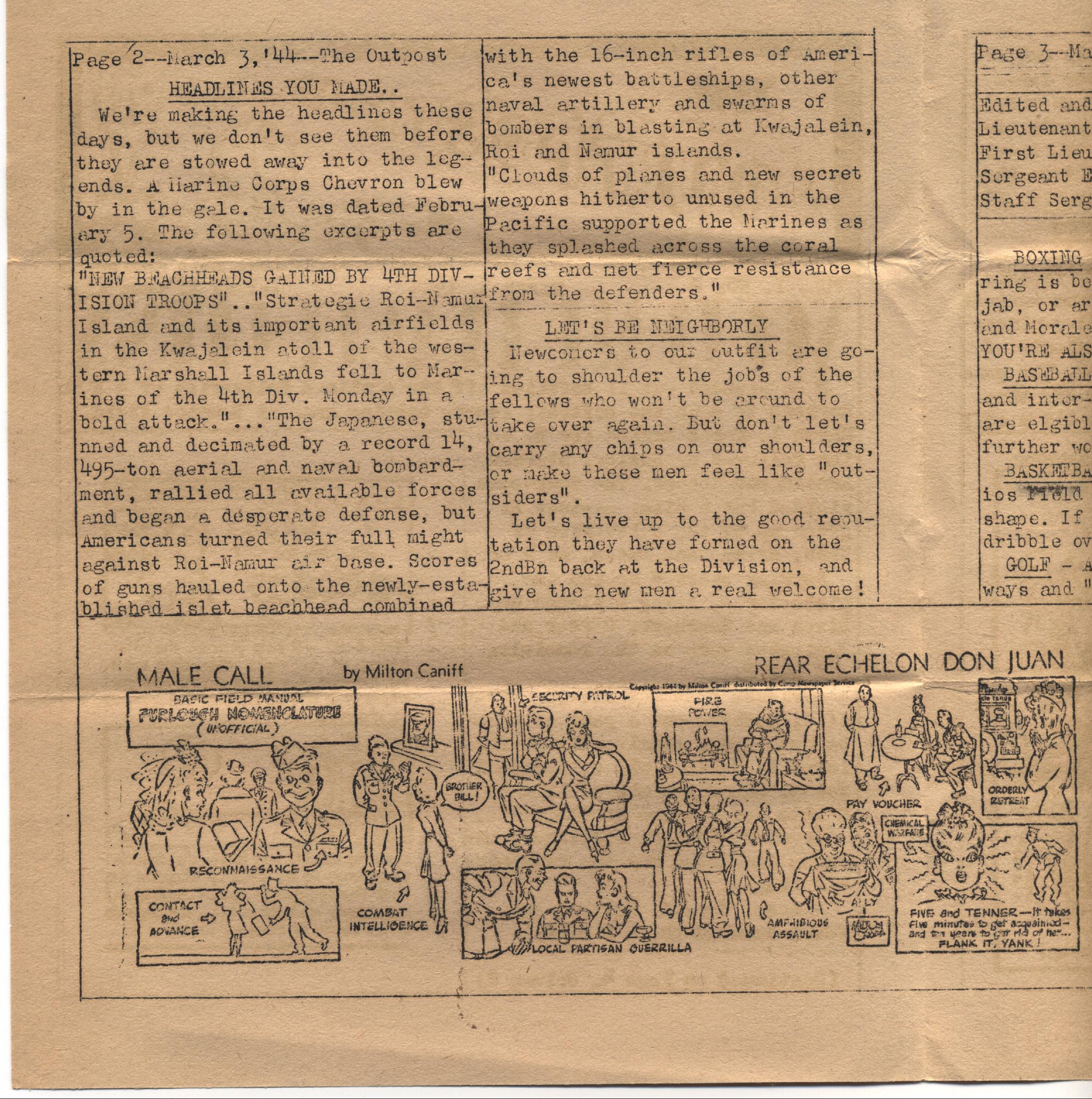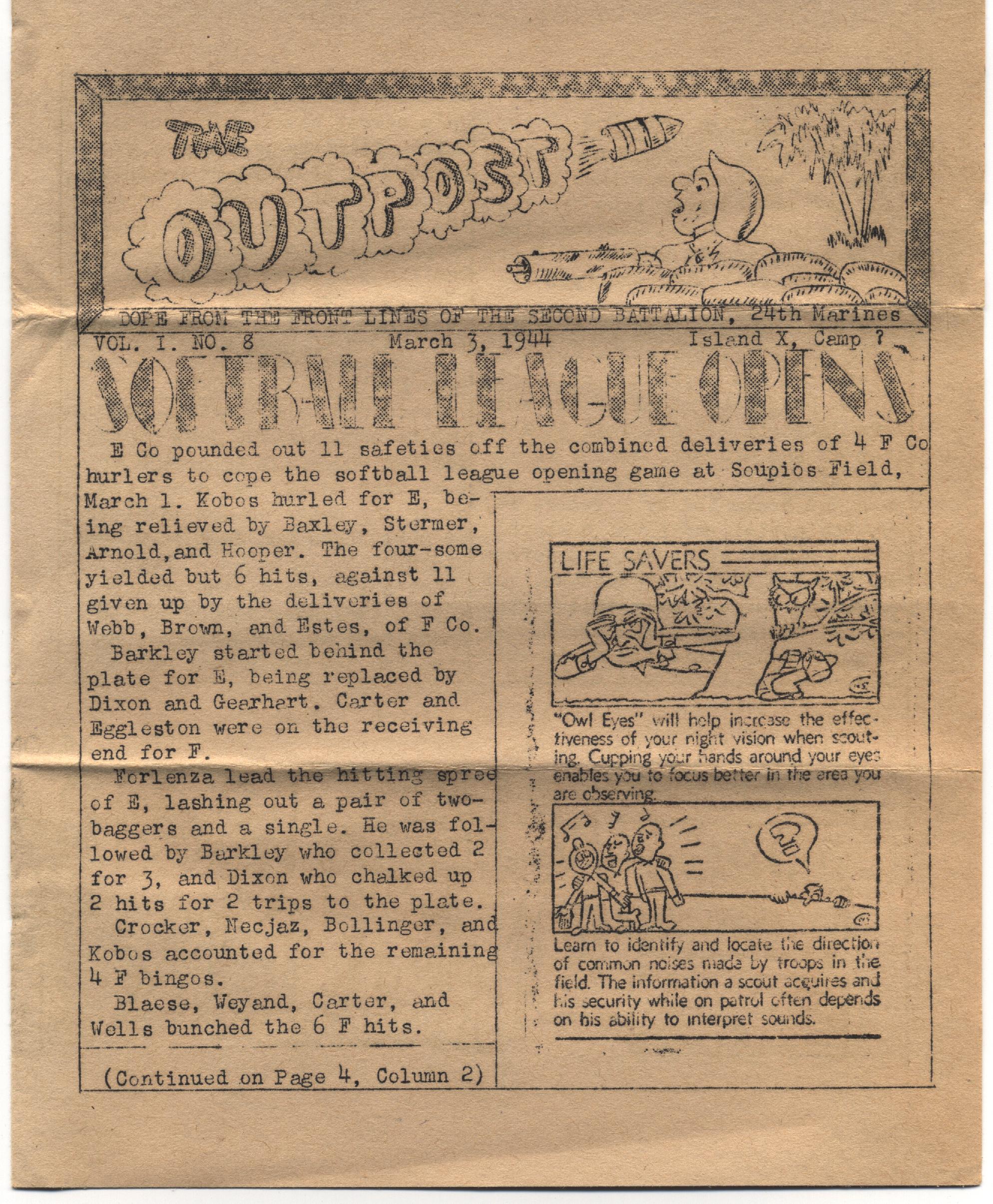 The Outpost was a small newsletter published for members of the 2nd Battalion, 24th Regiment, 4th Marines at Camp Maui. I have copies saved by Sgt. Leon Padelskas.