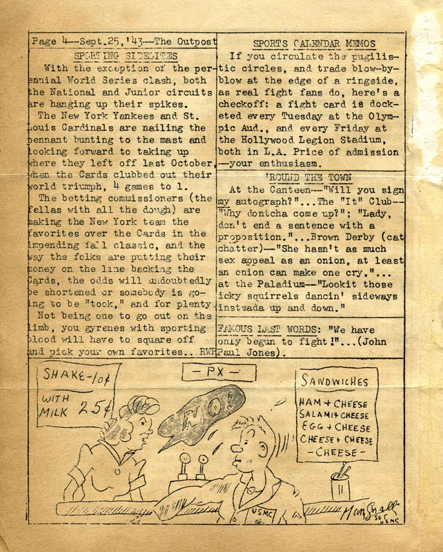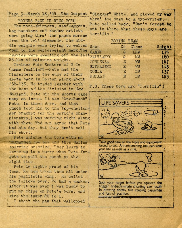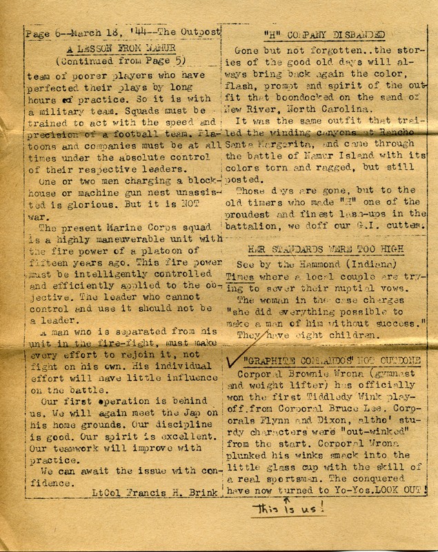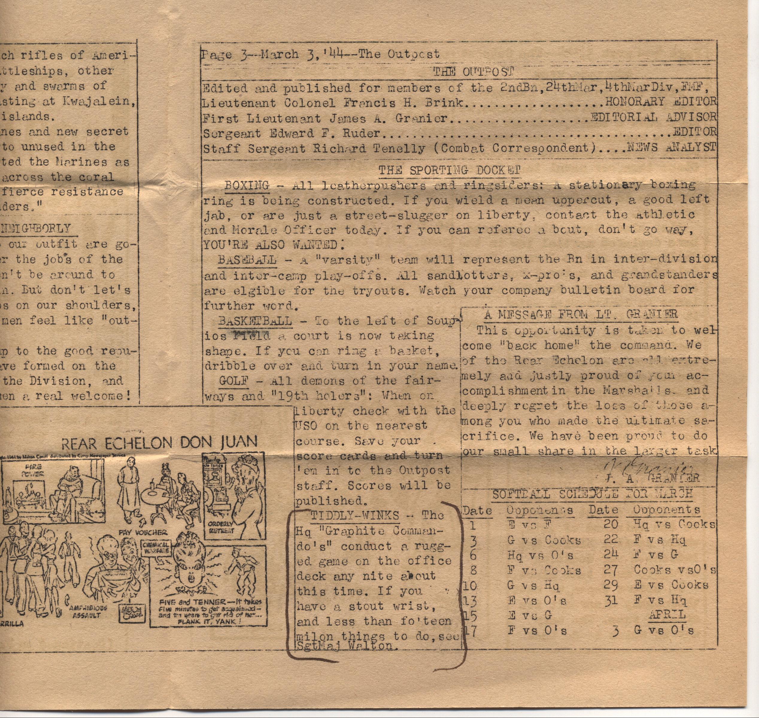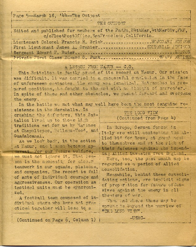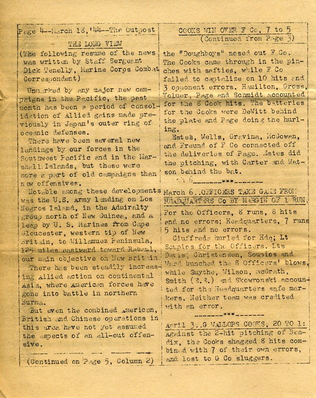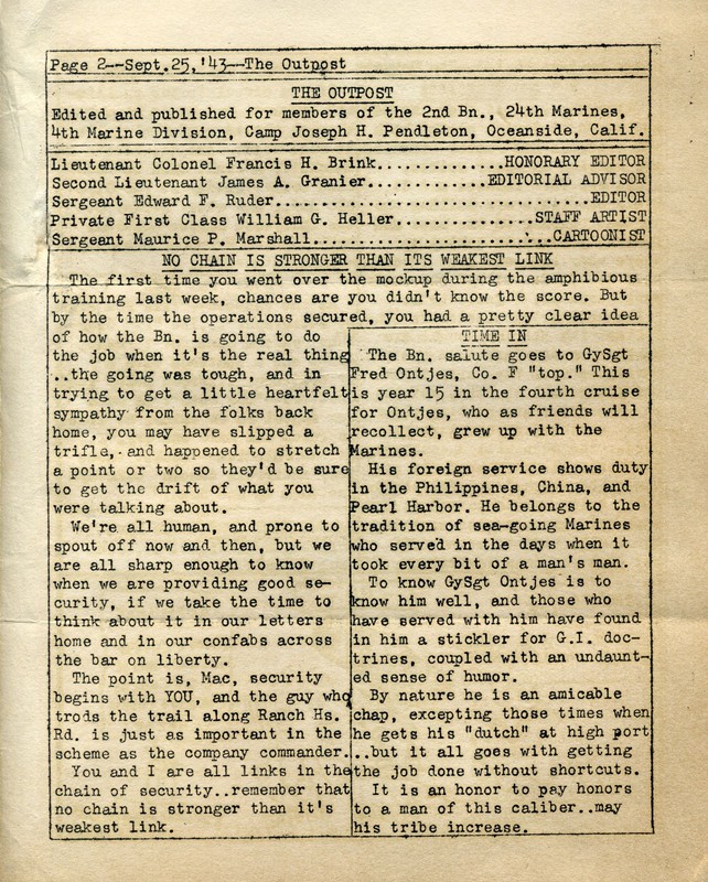 The Outpost was a small newsletter published for members of the 2nd Battalion, 24th Regiment, 4th Marines at Camp Maui. I have copies saved by Sgt. Leon Padelskas.