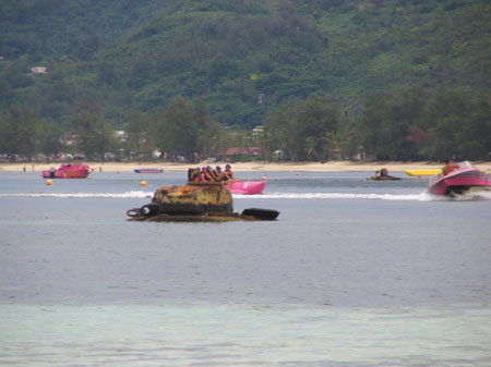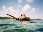 American Tank off Invasion Beach Japanese tourists frolic by tank American Tank faces beach