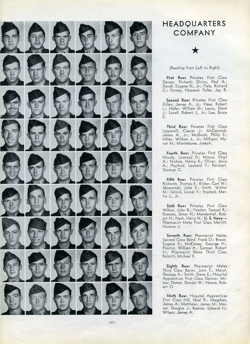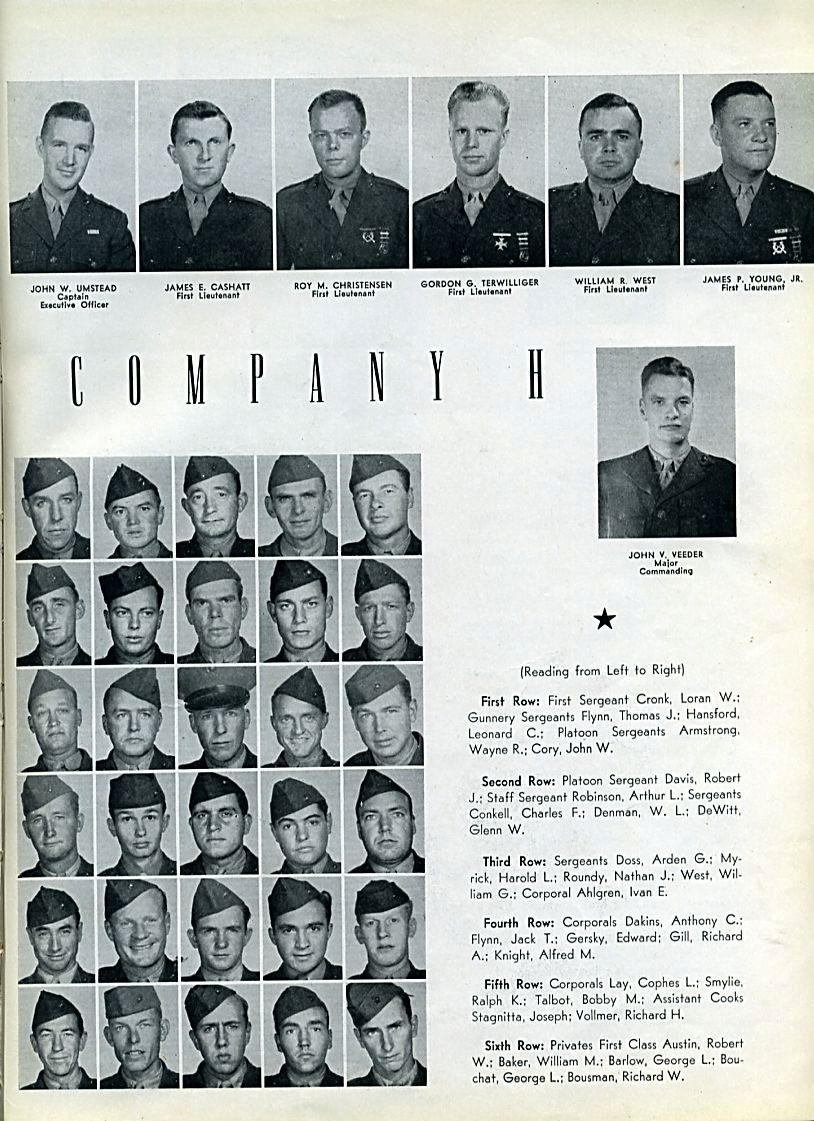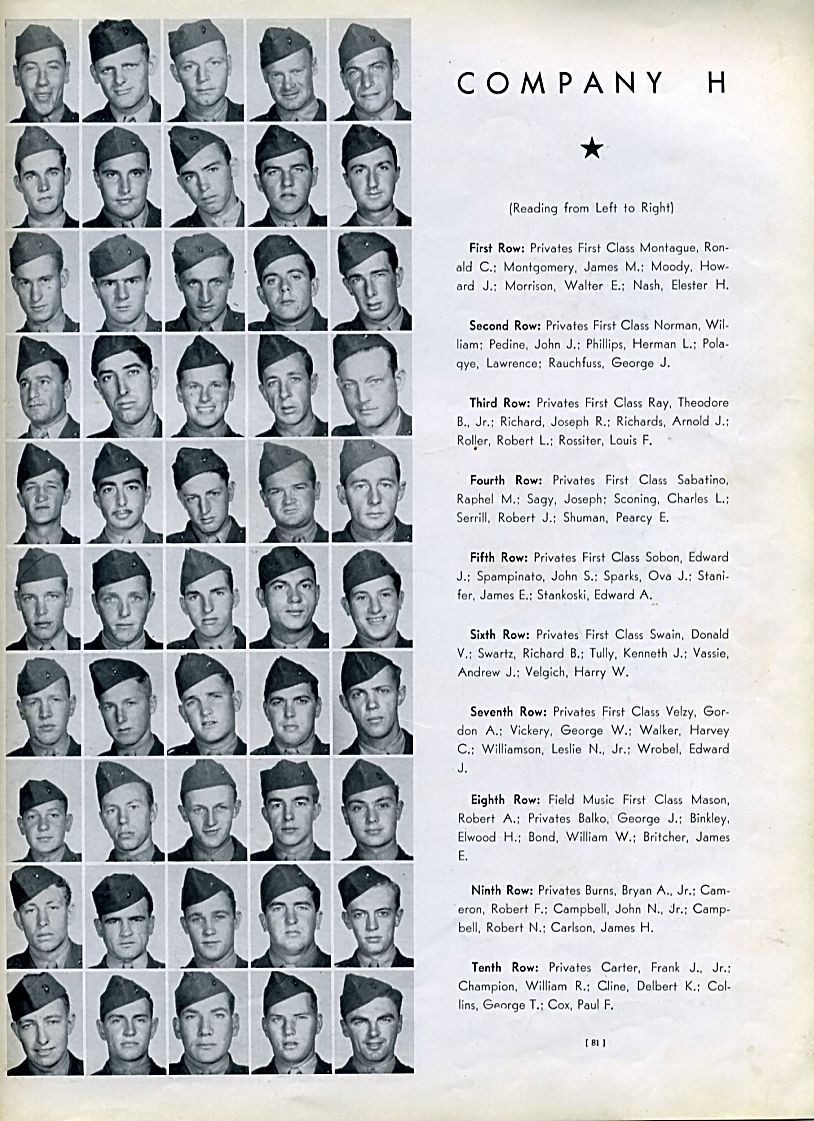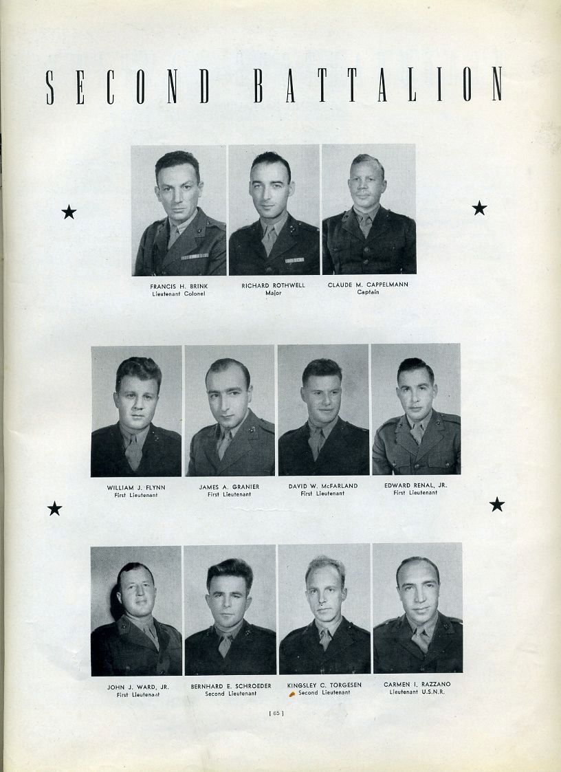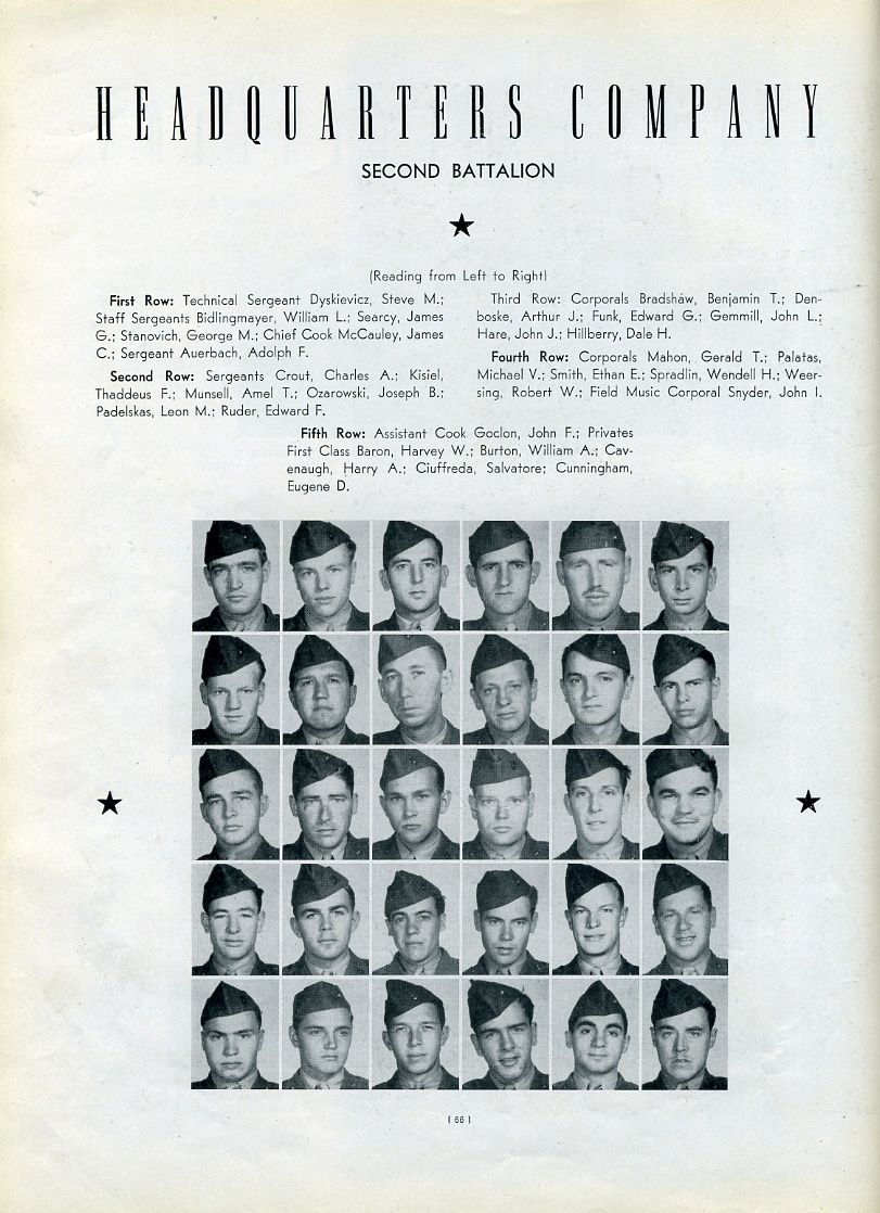 In 1943 when the 24th Regiment was formed the famous "Red Book" was issued. It was what we in the Navy call a "Cruise Book". This book contains a short history, various pictures some of the Regiment, and most importantly portraits of each man in the Regiment by Battalion and Company. Here presented are the Men of the 2nd Battalion.